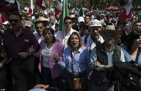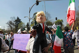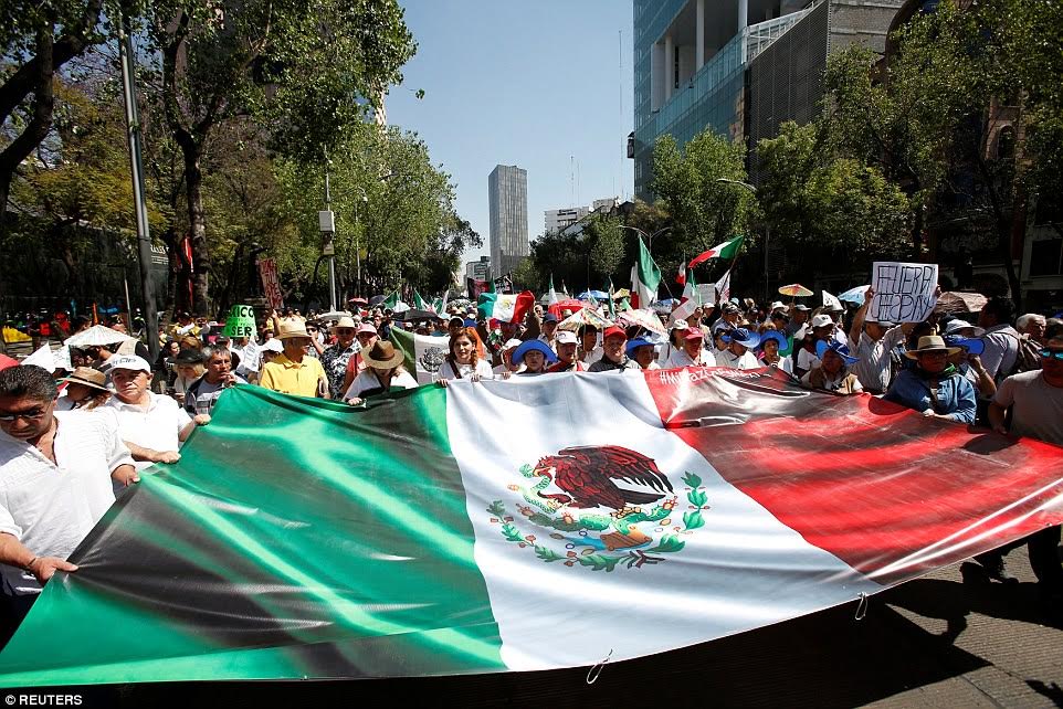 They also stood against the pressure he is putting on U.S. corporations to provide jobs in the United States, not Mexico. Demonstrators carried Mexican flags and dressed in white as a sign of unity.