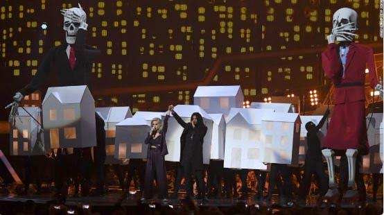 The two skeletons paraded around on stage holding hands in what clearly depicts their recent meeting at the White House.