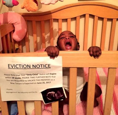 EVICTION NOTICE: Please Note That Your “Only-Child” Status Will Expire Within 18 Weeks. You are required to VACATE the Premises as a New Tenant is Expected on June 25, 2017. -Thanks, Management aka Mommy and Da Da P.S. ISSAAA BOOOOYYYYYYY!!!!