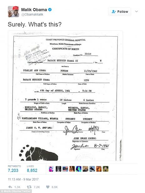 Malik has not made secret the fact that he is not in support of his brother and in a recent attack on Barack, he posted an image of a Kenyan birth certificate which he claims belongs to the former US president. See it after the cut…