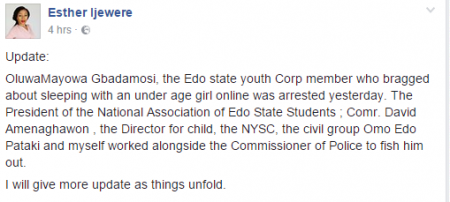 Confirming his arrest, the National Coordinator of Walk Against Rape Nigeria, Esther Ijewere said: “The Edo state youth Corps member who bragged about sleeping with an underage girl online was arrested yesterday.