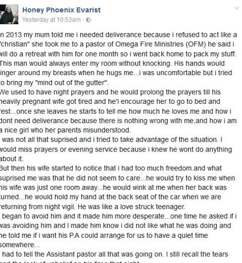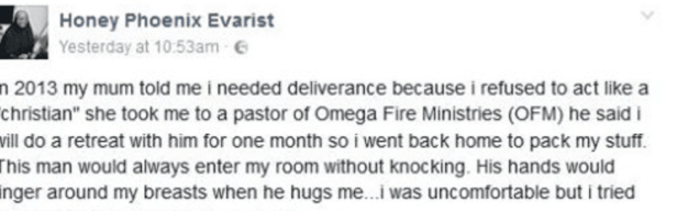 A Facebook user, Honey Phoenix Evarist shared this story last year about how a Pastor of Omega Fire Ministries allegedly sexually assaulted her in 2013 after the mum took her to the pastor for not acting like a Christian.