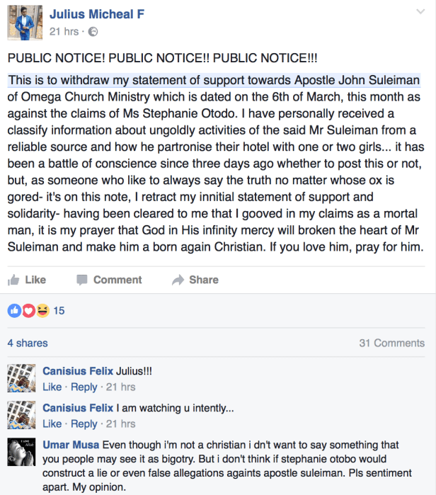 “This is to withdraw my statement of support towards Apostle John Suleiman of Omega Church Ministry which is dated on the 6th of March, this month as against the claims of Ms Stephanie Otodo.