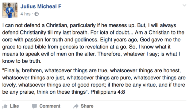 Lagos based author and publisher, Julius Michael who was standing by and defending the founder of Omega Power Ministries, just retracted his support and added his reasons.