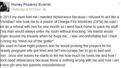 Back in 2016, a lady took to Facebook to reveal she was sexually harassed by a pastor at Omega Fire Ministries,whose leader, Apostle Suleman is currently embroiled in a sex scandal .As new allegations claim he was in a relationship with actress Daniella Okeke, the lady’s old post has been dug out..Read what she wrote below