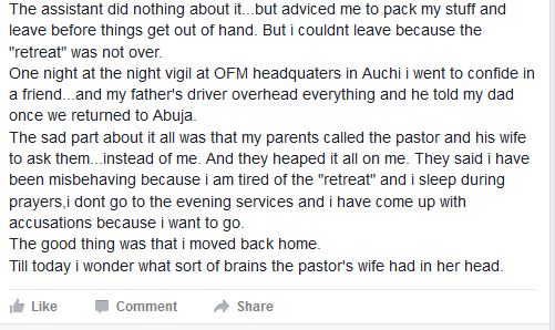 This man would always enter my room without knocking. His hands would linger around my breasts when he hugs me…I was uncomfortable but I tried to bring my “mind out of the gutter”.We used to have night prayers and he would prolong the prayers till his heavily pregnant wife got tired and he’ll encourage her to go to bed and rest…once she leaves he starts to tell me how much he loves me and how I dont need deliverance because there is nothing wrong with me, and how I am a nice girl who her parents misunderstood.