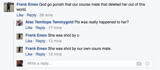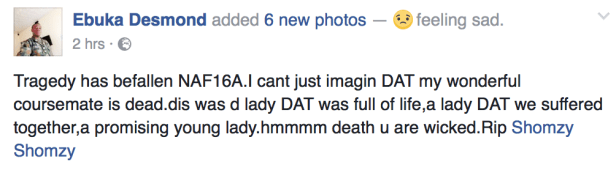 Edward Desmond, one of Shomzy’s colleagues broke the sad news on Facebook while another colleague revealed she was shot by one of their course mates in Makurdi. See photos below.