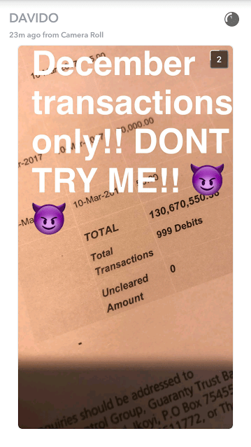 Davido has now revealed via his Snapchat that he spent over 130 Million last December, saying Hushpuppi is hungry for fame and he better leaves Naija. See below…