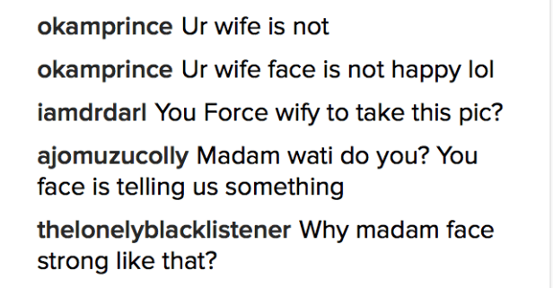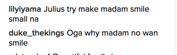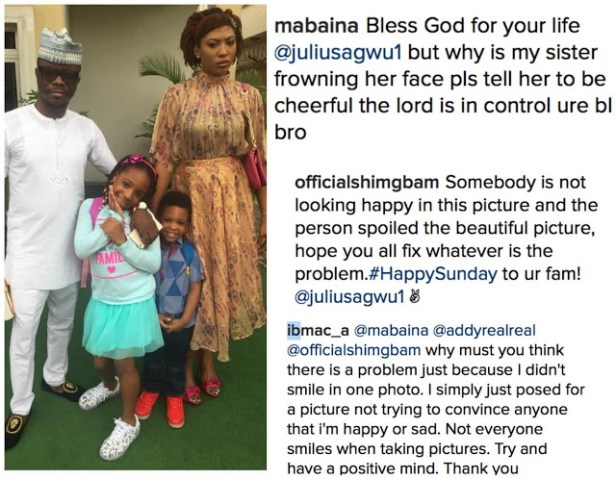 This conversation happened on comedian Julius Agwu’s Instagram page just because he made the ‘mistake’ of uploading a family photo that had his wife not smiling.