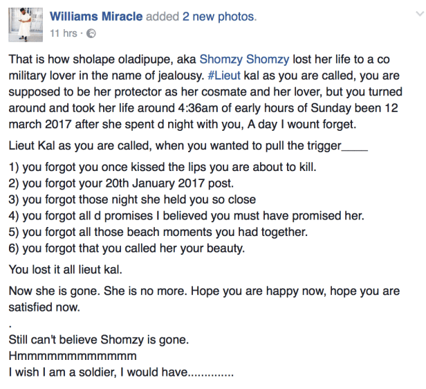 That is how sholape oladipupe, aka Shomzy Shomzy lost her life to a co military lover in the name of jealousy. #Lieut kal as you are called, you are supposed to be her protector as her cosmate and her lover, but you turned around and took her life around 4:36am of early hours of Sunday been 12 march 2017 after she spent d night with you, A day I wount forget.