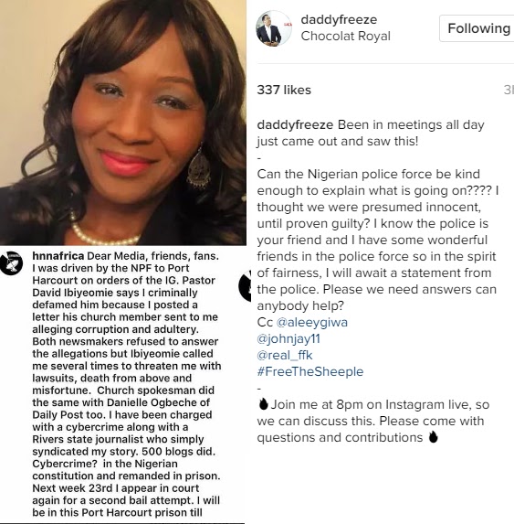 Uncategorized What’s going on with Kemi Olunloyo? Daddy Freeze demands answers following her arrest Date: March 17, 2017Author: daybreaknewonline 0 Comments Daddy Freeze has demanded answers from the Nigerian police following the arrest of outspoken journalist,Kemi Olunloyo. She revealed she was driven from Ibadan to Portharcourt where she is locked upon the orders of Pastor Ibiyeomie. Share this: Share on X (Opens in new window) X Share on Facebook (Opens in new window) Facebook Share on LinkedIn (Opens in new window) LinkedIn Share on Pinterest (Opens in new window) Pinterest Share on Telegram (Opens in new window) Telegram Share on WhatsApp (Opens in new window) WhatsApp Email a link to a friend (Opens in new window) Email Like Loading... Related