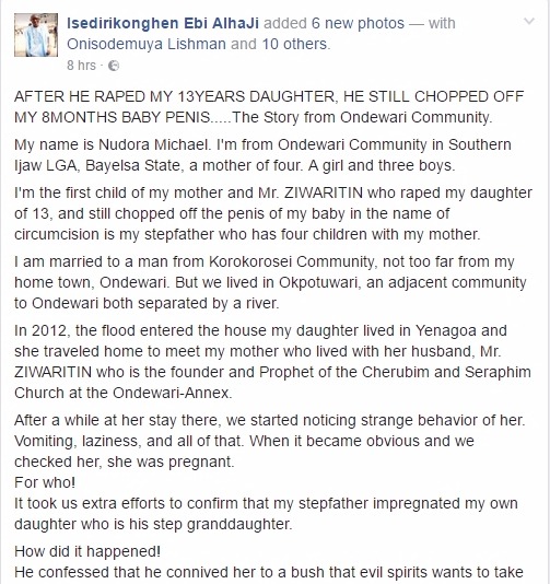 According to Ebi Alhaji who shared the story on Facebook, The Penis of an 8months baby was chopped off by his stepfather in Bayelsa state.
