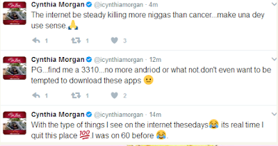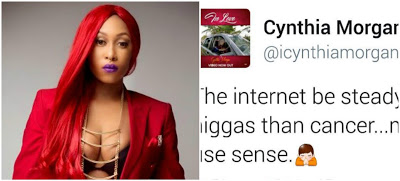 Uncategorized Find me a Nokia 3310′ – Rapper, Cynthia Morgan plans to quit the Internet completely Date: March 18, 2017Author: daybreaknewonline 0 Comments Nigerian born songwriter, rapper and singer, Cynthia Morgan, says she plans to completely leave the Internet 100% soon. The 25-year-old Northside Ent. signed dance-hall act took to her Twitter handle in bitter words and wrote Who has a Nokia 3310? Share this: Share on X (Opens in new window) X Share on Facebook (Opens in new window) Facebook Share on LinkedIn (Opens in new window) LinkedIn Share on Pinterest (Opens in new window) Pinterest Share on Telegram (Opens in new window) Telegram Share on WhatsApp (Opens in new window) WhatsApp Email a link to a friend (Opens in new window) Email Like Loading... Related