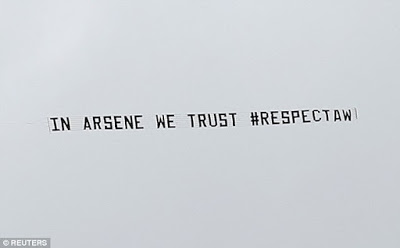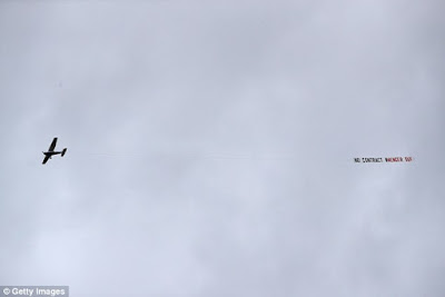 They made their feelings clear by crowdfunding an aeroplane to tow a banner reading ‘No Contract #Wenger Out’ over the ground during their Premier League match against West Brom on Saturday but they were met by an opposition of pro Wenger supporters who also paid a plane to fly too. See the pictures after the cut…