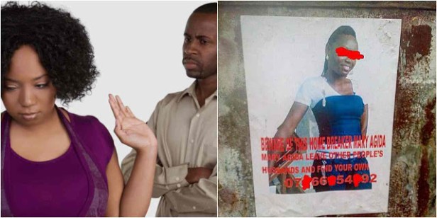 An aggrieved housewife has flooded the streets of Calabar with posters of her husband’s sidechic. The sidechic, Mary Agida, whose name and phone number was boldly written on the poster, was asked to go find her own husband and also accused of being a home breaker.