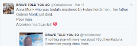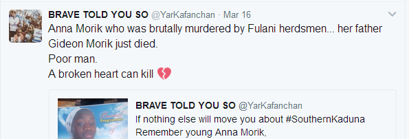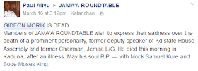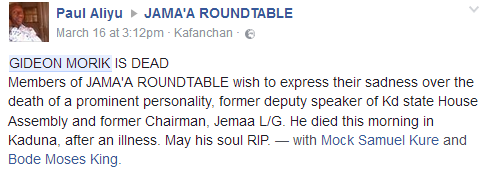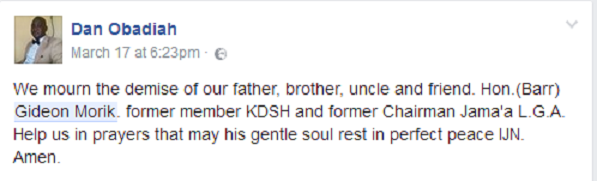 Barr. Gideon Morik, a former Chaiman of Jama’a Local Government Area in Southern Kaduna and father of 14-year-old Anna Morik, is dead. Hon. Morik passed away on March 16th, 2017, after a brief illness. LIB recall that on Christmas eve December 24th, 2016, Hon. Morik’s community was invaded by Fulani herdsmen. His daughter was among those brutally massacred. Hundreds of houses were burnt down and property worth hundreds of millions of Naira destroyed. More photos and condolence messages from his family and friends after the cut…