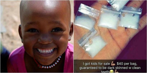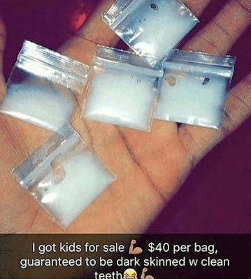 “I got kids for sale, $40 per bag , guaranteed to be dark skinned w clean teeth”