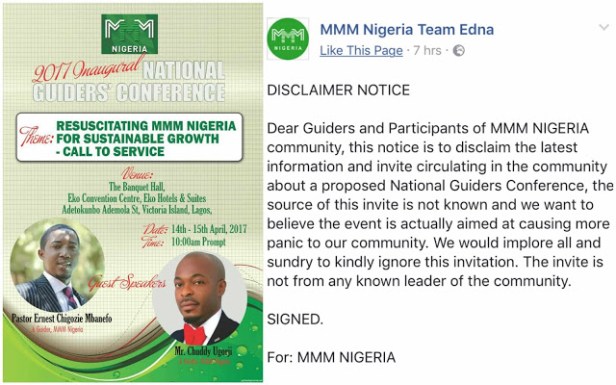 MMM Nigeria has denied being the ones hosting an alleged Inaugural National MMM Guiders Conference supposedly meant to hold 14th to 15th April, 2017 in Lagos. ‘