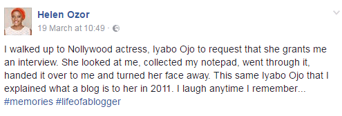 According to her, the actress looked at her, collected her notepad, went through it, handed it back to her and turned her face away. She also revealed she explained what a blog is to Iyabo in 2011. Read below…