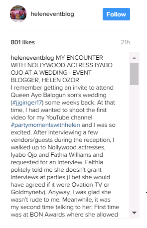 Event blogger, Helen Ozor, has narrated her encounter with actress Iyabo Ojo when she met her at an event and tried to have an interview with her.