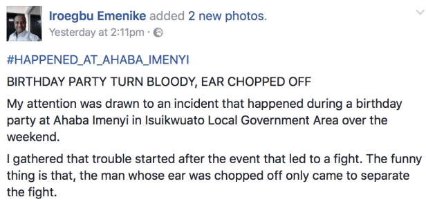 The unthinkable happened to a peacemaker when he jumped in to separate a fight at a birthday party in Abia state last weekend. Young man lost a huge chunk of his ear which was sliced off during the commotion.