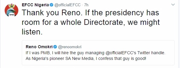 See EFCC epic reply to Reno Omokri after saying presidency should hire the guy behind their Twitter handle (Snapshot)