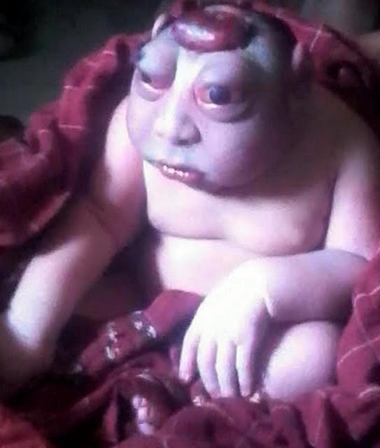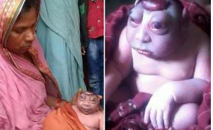The unusual looking baby, from India, was born with a tiny head, bulging eyes and a hard, shell-like body.He has been swarmed by local visitors who believe he is a reincarnation of a Hindu God.