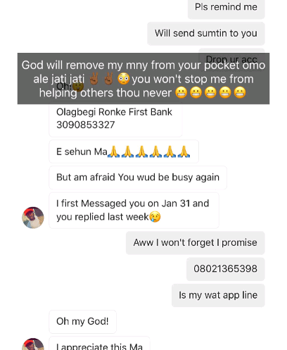 Instagram user, Jubilee Ola have exposed a notorious social media beggar who has succeeded in scamming many people, using school fees as a tool for begging.