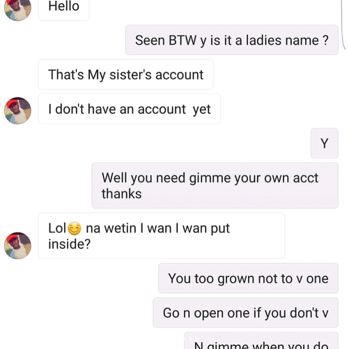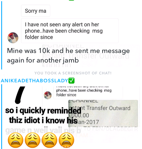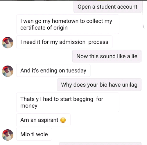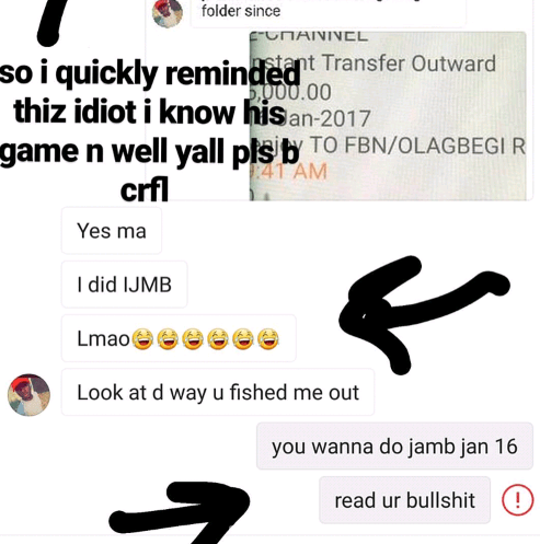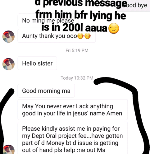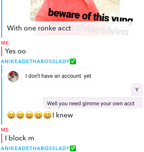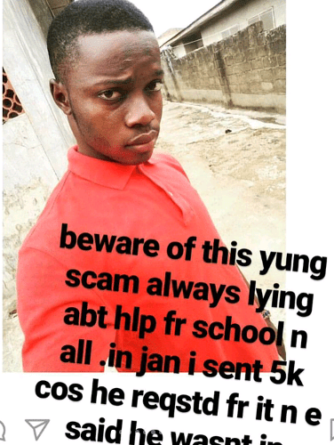“Hey Guys well I don’t do this but pls I don’t want another person falling a victim of this useless lie boi scam. In Jan while I was in nija he message he needed help 5k fr jamb or so as someone who doesn’t know the educational system in Nigeria I gave it to him 5k n well I suspected something was up wen he sent me one ladies account I just felt lik doing my own for God ! Yesterday night only for me to see he comes up with a story again 😂 I guess he thought I deleted the previous convo or forgot 😪 so he starts d story of paying fr project n all dat extra shiiii🌚 I smiled he said he was in 200level in Aaua I ad to look that shit up on google cos I ad no idea wat aaua was so I saw it’s a school in ondo or so. I screenshot his previous message n sent him n he was lik oh I fished him out 😿 in Jan he wanted to do jamb in march he is 200l ? Well I block him n went on snap to my greatest surprise he has abt 3ppl too he has done such too .pls beware of this little shrimp bks he is closing doors fr ppl who actually needs help 💯”