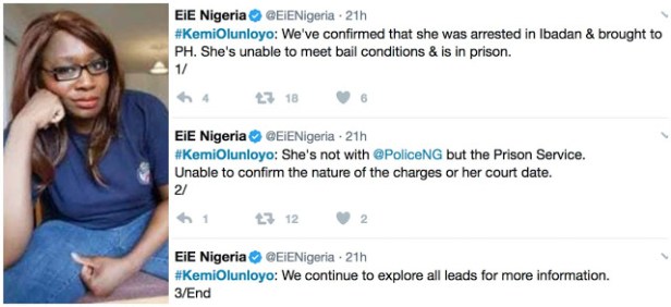 #KemiOlunloyo: We’ve confirmed that she was arrested in Ibadan & brought to PH. She’s unable to meet bail conditions & is in prison.