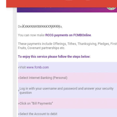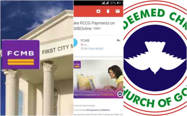 A Nigerian bank, First City Monument Bank (FCMB), is reportedly advertising for payment of Redeemed Christian Church of God Offering and Tithe with their application.
