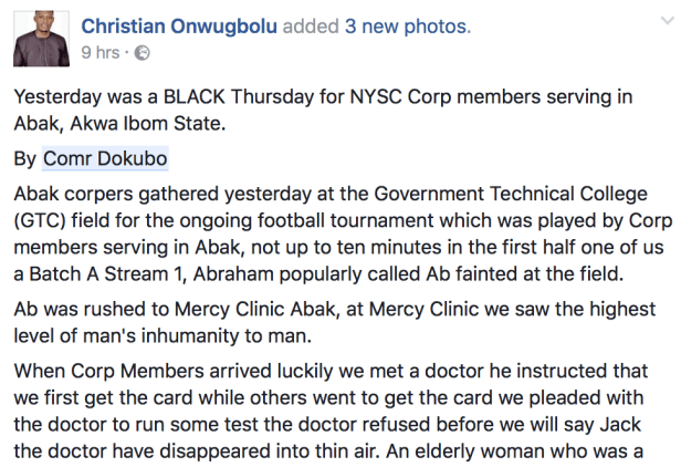 One of them, a Batch A Stream 1 corp member, Abraham popularly called Ab, fainted during a football match, was rushed to a hospital where he lost his life after the medical doctor on duty allegedly refused to attend to him.