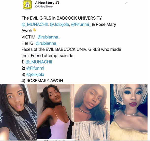 An IG user, has taken to the social media platform to call out some big girls of Babcock University who made a fellow student attempt suicide.