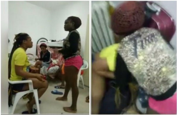According to information gathered online, the ladies/migrants who are currently in an undisclosed camp in Europe took it out on each other with the one named Happy (in pink bum shorts) beating her colleague mercilessly till she passed out.