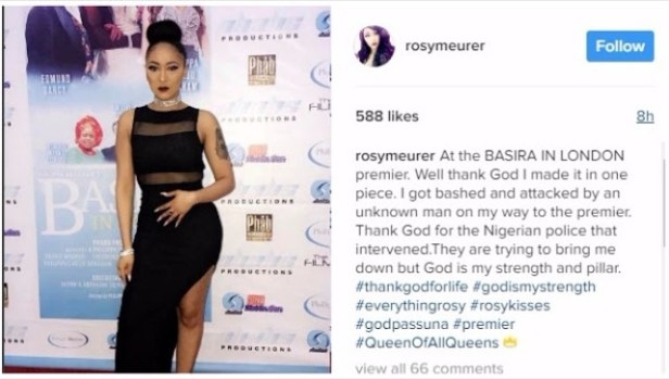Nollywood actor and Model, Rosaline Meurer has just revealed that she was attacked yesterday by an unknown man on her way to a movie premiere in Lagos.