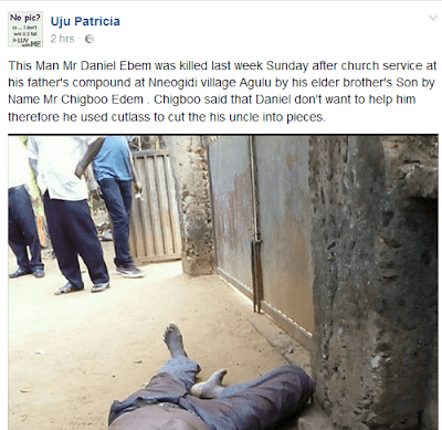 A man named Daniel Ebem has been brutally murdered allegedly by his elder brother’s son, Chigbo Edem because Daniel ‘refused to help him succeed in life’.