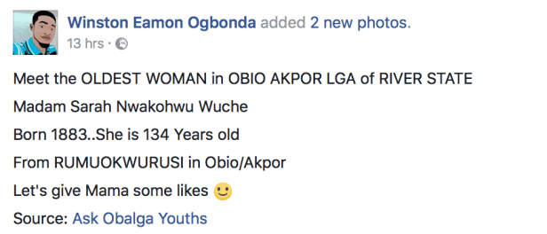 Madam Sarah Nwakohwu Wuche from Rumuwokerebe in Rumuokwurusi community, reportedly born 1883, now aged 134 years, is said to be the oldest woman in Obio Akpor LGA, Rivers state.