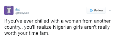 A twitter user, @MexyCoo, woke us all up with tweets about Nigerian girls and according to him, men will realize that Nigerian girls are not really worth their time, if they’ve chilled with girls from another country.