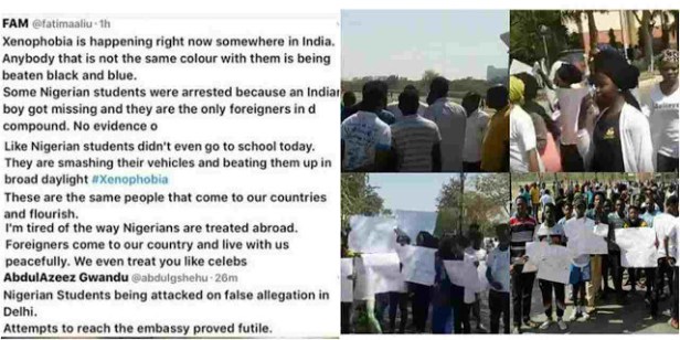 According to a Twitter user #fatimaaliu, some Nigerian students who live in a compound in Delhi where an Indian boy got missing, were beaten mercilessly today, while some were arrested with no evidence. The Twitter user went on to disclose that most Nigerian students didn’t go to school today, because their car was smashed in broad daylight.
