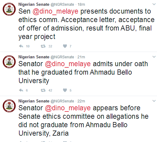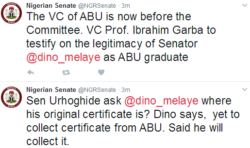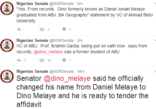 ABU VC, Prof. Garba today appeared before the Senate and confirmed that from past records, Sentor Dino Melaye graduated from the institution. He however said he graduated as Daniel Jonah Melaye with a BA in Geography. Continue to see more tweets and photos below…