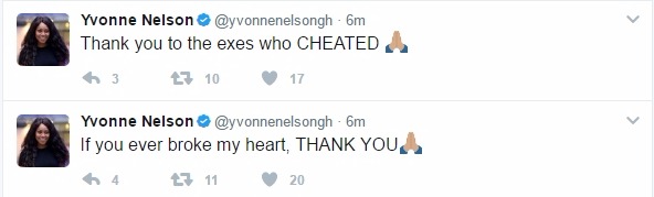 Uncategorized Yvonne Nelson thanks all her exes who cheated and those who broke her heart in new epic tweets Date: March 27, 2017Author: daybreaknewonline 0 Comments The Ghanaian actress just dropped ‘weird’ looking tweets. Wawuu! Share this: Share on X (Opens in new window) X Share on Facebook (Opens in new window) Facebook Share on LinkedIn (Opens in new window) LinkedIn Share on Pinterest (Opens in new window) Pinterest Share on Telegram (Opens in new window) Telegram Share on WhatsApp (Opens in new window) WhatsApp Email a link to a friend (Opens in new window) Email Like Loading... Related