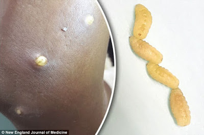 Squeezing the sore revealed the woman was infested with the larvae of the tumbu fly, a species found in the tropics of Africa, which gorge on human flesh.