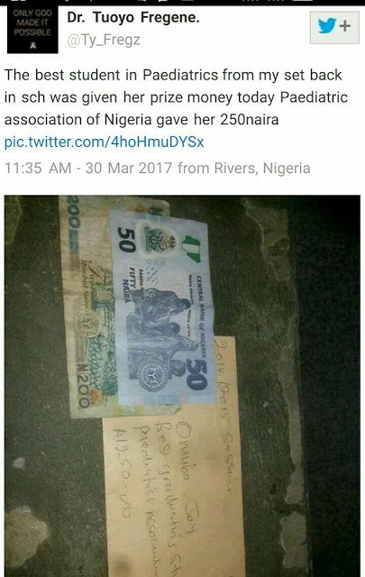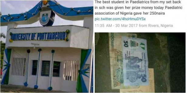 Just when you think we’re moving forward in life, you get a shocker that makes you start all over again. According to a Twitter user, @Ty_Fregz, the Best student of Pediatrics from University of Port Harcourt allegedly received her prize money of N250, two years after graduation today.
