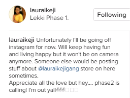 “Unfortunately I’ll be going off instagram for now. Will keep having fun and living happy but it won’t be on camera anymore. Someone else would be posting stuff about @lauraikejigang store on here sometimes.
