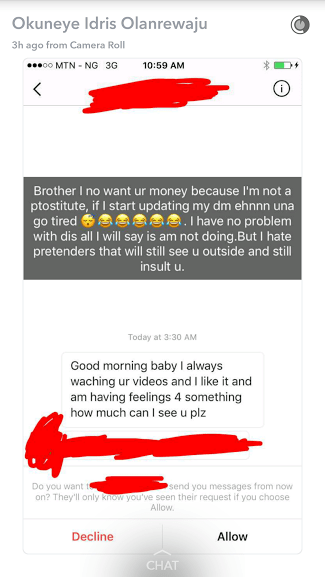 Uncategorized Bobrisky displays private messages he receives from guys, says he’s never gone down with any Date: April 7, 2017Author: daybreaknewonline 0 Comments Nigerian male barbie, Bobrisky have displayed some of what goes down in his DM on Snapchat. He also said that no matter how guys try to disturb him to have sex with him, he would never get down with them. See below… Share this: Share on X (Opens in new window) X Share on Facebook (Opens in new window) Facebook Share on LinkedIn (Opens in new window) LinkedIn Share on Pinterest (Opens in new window) Pinterest Share on Telegram (Opens in new window) Telegram Share on WhatsApp (Opens in new window) WhatsApp Email a link to a friend (Opens in new window) Email Like Loading... Related
