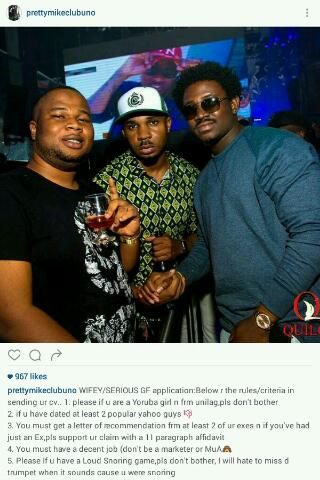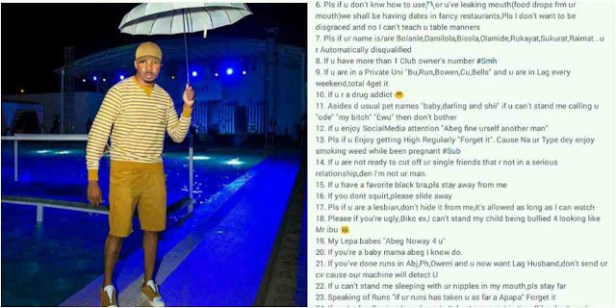 He also disclosed that if she’s a Yoruba lady and schooled in Unilag, she should forget about being his wife.