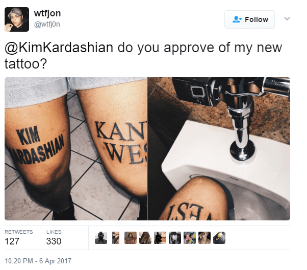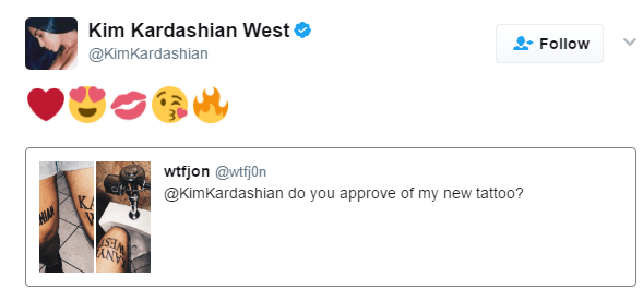 A die-hard fan of Kimye who got the power couple’s names inked on his thighs tweeted the picture to Kim Kardashian asking if she approves..In response, he got a tweet full of love struck emojis from the reality star..