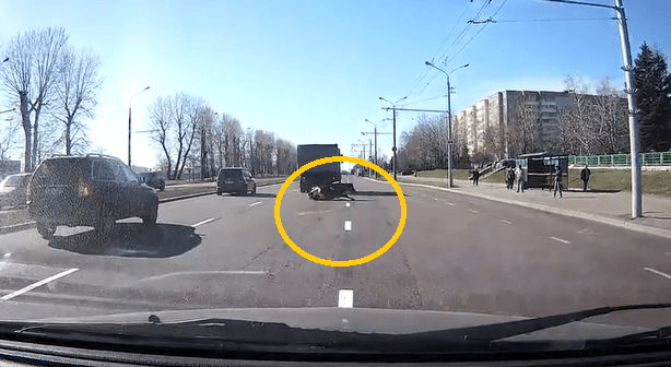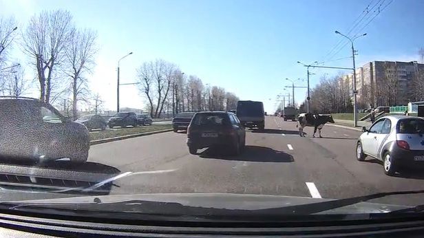 Dashcam footage captured in Minsk, Belarus, showed the black-and-white cattle drop onto the road in Minsk, Belarus, after the rear door suddenly flapped open.