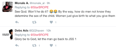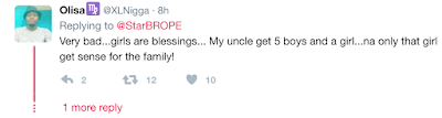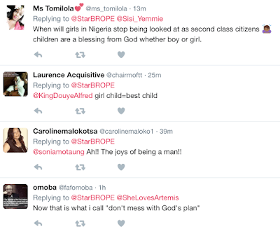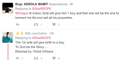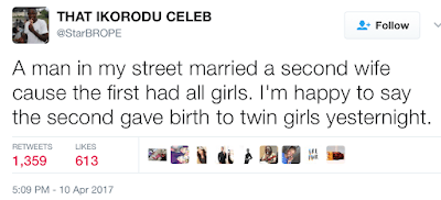 A man in my street married a second wife cause the first had all girls. I’m happy to say the second gave birth to twin girls yesternight.