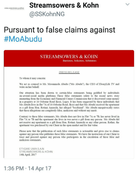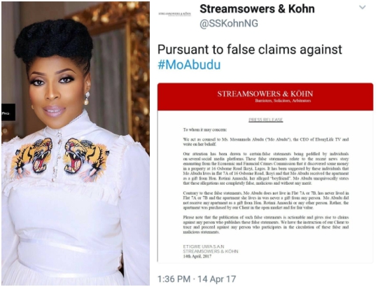 ‘Mo Abudu did not receive any apartment as a gift from Hon Rotimi Amaechi or any other person. Rather the apartment was purchased by our client in the open market and for fair value’.